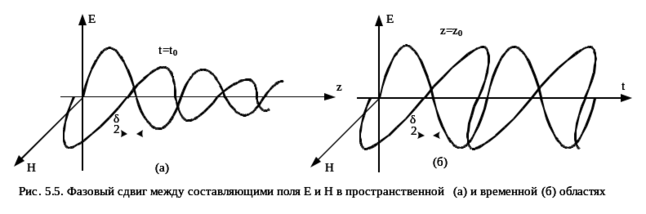 имеет место сдвиг фаз. Таким образом, в средах с проводимостью, отличной от нуля, электрическое и магнитное поля сдвинуты относительно друг друга по фазе в пространстве и времени (рис.5.5).