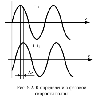 Фазовой скоростью волны назы-вается скорость перемещения фронта. Пусть волна распространяется в направлении z. На рис.5.2 показаны два состояния волнового процесса в моменты времени t1 и t2. За время