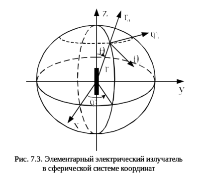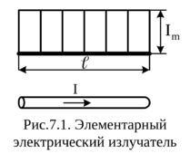ешение задачи значительно упрощается при условии, что амплитуда и фаза тока по всей длине антенны постоянны. Проводник конечной длины всегда можно представить совокупностью отрезков бесконечно малой длины, на протяжении которых амплитуда тока и его фаза практически не изменяется. Тогда результирующее поле излучения проводника с током можно представить как сумму полей, создаваемых отдельными отрезками проводника. Проводник с бесконечно малой (по сравнению с длиной волны) длиной и постоянными амплитудой и фазой электрического тока по всей его длине называется элементарным электрическим излучателем (рис.7.1).