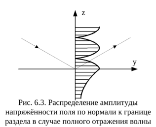 Первый сомножитель выражения (6.13) представляет собой поверхностную волну, распространяющуюся вдоль границы раздела, а второй сомножитель показывает, что амплитуда этой волны в направлении нормали к границе раздела изменяется по закону стоячей волны (рис.6.3). Фазовая скорость поверхностной волны определяется выражением