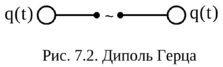 остоянство амплитуды тока по всей длине проводника в принципе возможно, как это следует из закона сохранения заряда, согласно которому амплитуда переменного во времени заряда пропорциональна изменению тока. Так как по условию амплитуда тока проводимости по всей длине проводника постоянна и скачком уменьшается до нуля на его концах, то именно на его концах должны быть сосредоточены заряды. Такой излучатель можно отождествить с электрическим диполем. Излучатель с подобными свойствами впервые был реализован Генрихом Герцем в виде симметричного вибратора длиной много меньше длины волны с металлическими шарами, установленными на его концах. Обладая большой электрической емкостью, эти шары способствуют накоплению зарядов на концах вибратора, что приводит к существенному выравниванию амплитуды тока по его длине. Впоследствии такой вибратор был назван диполем Герца (рис.7.2).