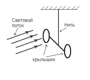 Основную часть прибора П. И. Лебедева для измерения давления света составляли лёгкие крылышки диаметром 5мм, подвешиваемые на упругой нити (рис.1.13) внутри вакуумированного сосуда. Крылышки изготавливались из различных металлов, слюды и их можно было заменять при проведении экспериментов. На крылышки с помощью системы линз, на показанной на рисунке, направлялся свет от сильной электрической дуги . В результате воздействия света на крылышки нить закручивалась и крылышки отклонялись . Опыты П. И. Лебедева полностью согласовывались с электромагнитной теорией Максвелла.