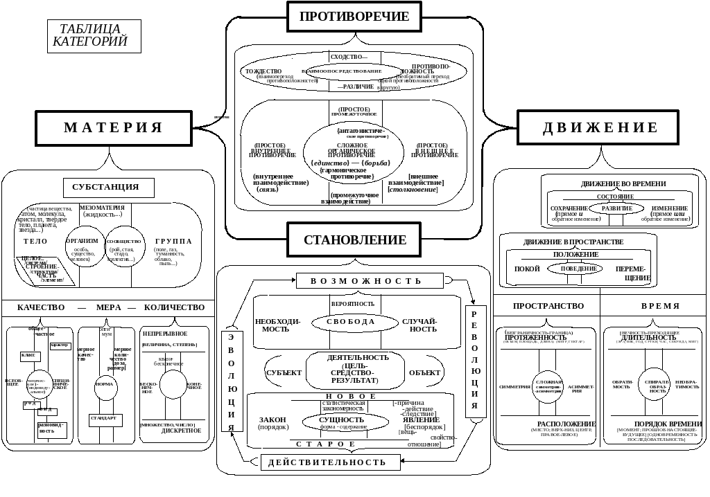 Таблица категорий является сравнительно простой. Каждая из четырех основных категорий расчленяется на целый «куст» категорий. Последние выражают в иерархическом порядке их отдельные стороны и частные виды. Конечно, это «расчленение» происходит только мысленно. На самом деле все категориальные определения одновременно соединены и разъединены, т. е. представляют собой некоторое единство многообразия или многообразие в единстве. Более того, все представленные в таблице категории, вернее, их объективные аналоги не существуют отдельно от единичных «вещей», материальных реальностей, т. е. о них нельзя говорить ни как о платоновских «идеях», ни как об универсалиях (в смысле средневекового реализма), ни как об онтологических сущностях, нейтральных по отношению к материальному и идеальному (в смысле «критической онтологии» Н.Гартмана).