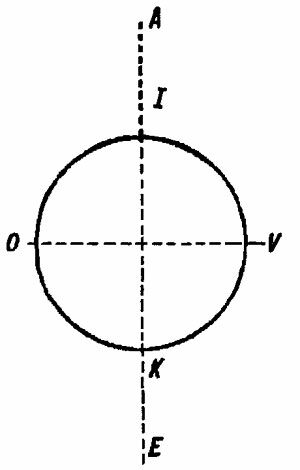 которая обозначает Землю, она движется мгновенно, поскольку имеет двигатель бесконечной силы. Она движется своим центром от А до E и возвращается от Е до А; это совершается в одно мгновение, причем она одновременна находится в A и в E и во всех промежуточных местах; она одновременно отправилась и возвратилась; и поскольку это всегда происходит таким образом, то и получается, что она всегда устойчива. Подобным же образом дело происходит относительно движения ее вокруг центра, где восток обозначен I, юг — V, запад — K, а север — O; каждая из этих точек вращается с бесконечною скоростью в силу бесконечного импульса, и поэтому она одновременно отправилась и возвратилась; вследствие этого она остается всегда неподвижной и есть там, где она была. Таким образом, в заключение, движение этих тел вследствие бесконечной силы — то же самое, что и неподвижность их; ибо двигаться мгновенно и не двигаться — это одно и то же. Остается, следовательно, другое активное начало движения, которое происходит от внутренней силы и вследствие этого происходит во времени и в определенной последовательности; это движение отличается от покоя. Вот каким образом мы можем говорить, что Бог движет все, и как мы должны понимать то, что он дает движение всему, что движется.