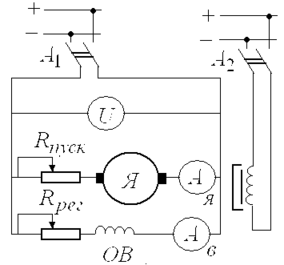 а) сопротивление пускового реостата полностью введено (ручка пускового реостата находится в крайнем левом положении, цепь якоря электродвигателя разомкнута);