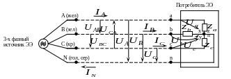 Электрическая схема трёхфазной четырехпроводной ЛЭП.