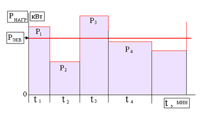 При работе в длительном режиме с переменной нагрузкой (рис.3) выбор номинальной мощности двигателя обычно проводится наиболее простым методом эквивалентной мощности:1. По нагрузочной диаграмме определяется эквивалентная мощность нагрузки на валу двигателя:
