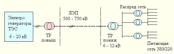 Большое количество электрической энергии, которая вырабатывается на мощных электростанциях, нужно передавать потребителям, которые находятся обычно на большом расстоянии от места её производства. Передачу электрической энергии можно осуществлять лишь за счёт некоторого количества самой электрической энергии. При передаче возникают тепловые потери электрической энергии – «джоулевы потери» » ∆Р=I2R, поэтому при передаче эл.энергии на далёкие расстояния и её распределении большое значение имеет сила тока, с которой передаётся эл.энергия, ведь от этого зависит толщина сечений проводов, соответственно расход материалов и экономичность ЛЭП.