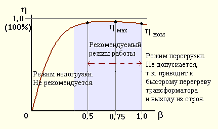 Потери в трансформаторе в номинальном режиме очень малы, ΔPтр ~ 1-3%, т.е. ηном = (97-99)%. Обычно трансформатор работает большую часть времени в режиме недогрузки, т.е. β = P2 / P2ном ≈ 0,5-0,7. Такой режим эксплуатации выбирается для того, чтобы при неожиданном подключении мощного потребителя трансформатор не оказался в режиме сильной перегрузки, что может привести к отключению трансформатора и возникновению аварийного режима в питающей сети. Поэтому проектирование и расчет трансформаторов выполняют таким образом, чтобы η макс приходилось на режим β = 0,5-0,7.
