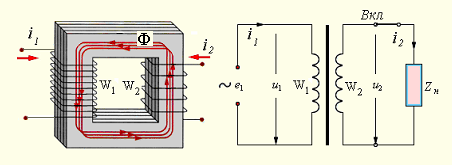 При подключении трансформатора к сети в первичной обмотке возникает переменный ток I1, который создаёт переменный магнитный поток Ф, замыкающийся по магнитопроводу. Поток Ф индуцирует в обеих обмотках переменные ЭДС – е1 и е2 пропорциональные по закону Максвелла числам витков W1 и W2 соответствующей обмотки и скорости изменения потока dФ/dt.