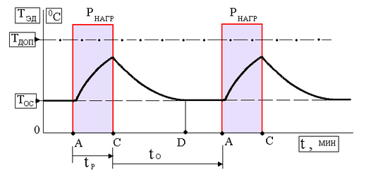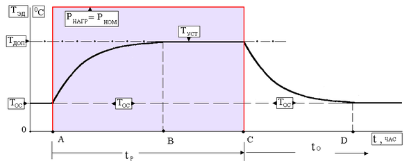 (т. А - включение нагрузки РНАГР = Р НОМ ; т. В – установление теплового равновесия при Т УСТ = const ; т. С - отключение нагрузки РНАГР = 0 ; т. D - установление теплового равновесия при ТЭД = Т ОС ; t Р - продолжительность работы двигателя с нагрузкой; t О - продолжительность останова двигателя)
