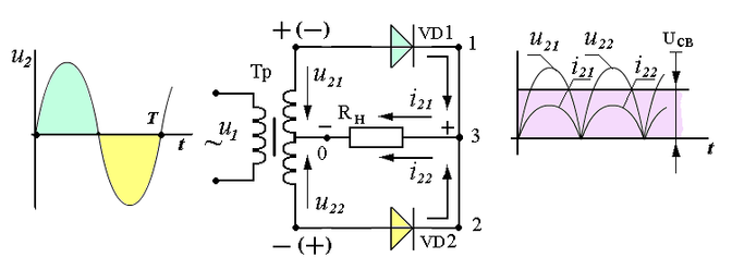По своей схеме такой двухполупериодный выпрямитель эквивалентен двум однополупериодным выпрямителям, работающим на общую нагрузку со сдвигом на полпериода, поэтому напряжение и ток в нагрузке состоят из положительных синусоидальных полуволн без пауз ( « + » со стороны катодов, точка 3 ).