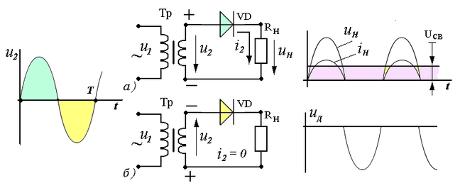 Рис. 18. Схема и осциллограммы однополупериодного однофазного выпрямителя