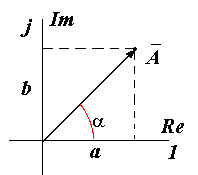 На комплексной плоскости в координатах (+1 , +j ) комплексное число Ā может быть представлено либо точкой с координатами ( a , b), либо вектором Ā, проведенным из начала координат в эту точку, и фазовым углом α .