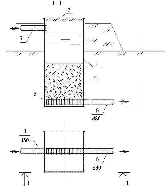 1 - корпус; 2 - крышка; 3 - подводящий трубопровод (d5); 4 - сорбент; 5 - дренаж; 6 - отводящий трубопровод очищенных сточных вод (d6) [5]
