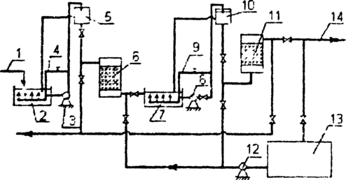 1 – вода после сооружений биологической очистки, 2 – приемный резервуар, 3 – насосная установка, 4 – устройство для перемешивания воды, 5 – распределительная камера, 6 – фильтр, загруженный песком, 7- приемный резервуар, 8 — насосная установка, 9 – устройство для перемешивания воды, 10-распределительная камера, 11 – сорбционный фильтр, 12 – промывной насос, 13 – резервуар промывной воды, 14 – сброс очищенной воды.