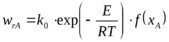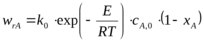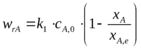 С одной стороны, как и скорость необратимой реакции [см. выражение (2)], она зависит от константы скорости k1 и глу­бины химического превращения хA, а с другой — определяется сте­пенью приближения реакционной системы к состоянию хими­ческого равновесия и значением предельно достижимой степени превращения в равновесных условиях xA,e. Характер изменения скорости с ростом температуры будет разным для эндо- и экзотер­мических реакций.