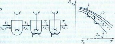 Рис. 1. Схема каскада реакторов идеального смешения с отводом теплоты в секциях каскада (а) и зависимости xA(Т), характеризующие процесс в нем (б).