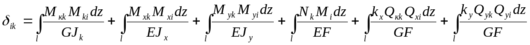 . Отсюда, δik – есть перемещение по направлению i-го силового фактора под действием единичного фактора, заменяющего k-й фактор. Но в данном случае (рама работает только на изгиб, а может работать на: кручение, растяжение, и изгиб) определения перемещения не обуславливается то, каким образом возникают перемещения δik. Для более полного определения перемещений пользуются интегралом Мора. Для определения величины δik следует вместо внешних сил рассматривать единичную силу, заменяющую k-й фактор. Поэтому внутренние моменты и силы MkP, MxP, MyP, NP, QxP, QyP заменим на Mкk, Mxk, Myk, Nk, Qxk, Qyk. Получим: