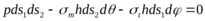 Двумя парами меридиональных и нормальных конических сечений выделим из оболочки элемент ds1, ds2. Будем считать, что на гранях элемента возникают напряжения σm и σt. Первое будем считать меридиональным напряжением. Вектор этого напряжения направлен по дуге меридиана. Второе напряжение σt называется окружным напряжением. Напряжения σm и σt, умноженные на соответствующие площади граней элемента, дадут силы σm·h·ds2 и σt·h·ds1. К этому же элементу приложена сила нормального давления p·ds1·ds2. Проектируя все силы на нормаль, получим: