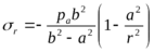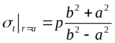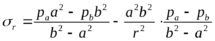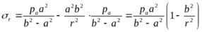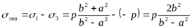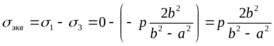. Это значит, что для цилиндра с бесконечно большой толщиной стенки радиальное напряжение в любой точке равно окружному и при отсутствии осевых напряжений все точки находятся в состоянии чистого сдвига. Далее, напряжения находятся в обратно пропорциональной зависимости от квадрата радиуса r. Если принять r=4a, то в точках, расположенных на таком расстоянии от оси, напряжения составляют всего 1/16 от максимальных. Следовательно, когда можно довольствоваться точностью расчётов в пределах 5-6% (практически большая точность и недостижима, хотя бы из-за упругих несовершенств материала), то цилиндр с отношением b/a>4 можно уже рассматривать как имеющий бесконечно большую толщину стенки. Эквивалентное напряжение при b→∞ будет равно: