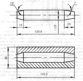 Уклоны знаков вертикальных стержней выбирают по ГОСТ 3606-57 (табл.9). По эскизу отливки зарисовывают конфигурацию стержня вместе со знаковыми частями и указывают его размеры (рис.3). По эскизу стержня оформляют контур стержневого ящика. Размеры ящика назначают конструктивно, чтобы толщина стенок была примерно равной половине диаметра стержня. Стержневые ящики изготовляют из древесины или металла.