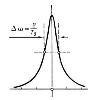Резонансная линия имеет ширину = 2/T2 (рис. 2). В сильных полях H1 наступает «насыщение» — увеличение ширины и уменьшение амплитуды линии при H1 > (T1T2)-1/2. Насыщение сопровождается уменьшением ядерной намагниченности. Этому соответствует выравнивание населённостей уровней в результате переходов, вызванных полем H1. Ширина линий в кристаллах определяется магнитным полем соседних ядер. Для многих кристаллов спин-спиновое взаимодействие ядер настолько велико, что приводит к расщеплению резонансной линии.