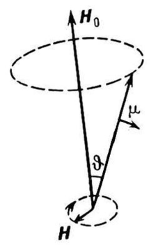 ЯМР, как и другие виды магнитного резонанса, можно описать классической моделью гироскопа. В постоянном магнитном поле H0 пара сил, обусловленная магнитным моментом , вызывает прецессию магнитного и механического моментов, аналогичную прецессии волчка под действием силы тяжести. Магнитный момент прецессирует вокруг направления H0 с частотой 0 = H0, угол прецессии остаётся неизменным (рис. 1). В результате воздействия радиочастотного поля H1 резонансной частоты 0 угол изменяется со скоростью Н1рад/сек, что приводит к значительным изменениям проекции на направление поля H0 даже в слабом поле H1.