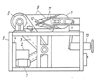 1 – электродвигатель; 2 – редуктор; 3 – цепная передача; 4 – клиноременная передача; 5 – рама; 6 – ведущий валок; 7 – ведомый отжимной валок; 8 – фильтрующие ленты; 9 – клиновая зона; 10 – ведомый вспомогательный валок; 11 – регулирующие тяги; 12 – исследуемый осадок; 13 – пружинное натяжное устройство