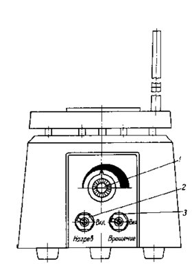 На основании мешалки установлен электродвигатель, на валу которого закреплен ротор с постоянным магнитом. В корпусе мешалки имеется электроплитка. На панели управления расположены: ручка 1 для регулирования скорости вращения мешалки, тумблер 2 для включения нагрева и тумблер 3 для включения электродвигателя мешалки.