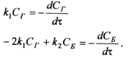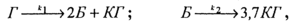 где Г - газойль (усредненная молекула углеводородов, входящих в состав газойля); Б - бензин (усредненная молекула углеводородов, входящих в состав бензина); КГ - крекинг-газ (усредненная молекула углеводородов, входящих в состав крекинг-газа); k1 - константа скорости реакции расщепления газойля; k2 - константа скорости реакции расщепления бензина.
