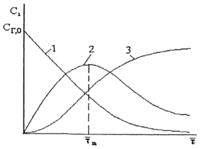 На рис. 3.4 представлены графики зависимостей СГ(τ), CБ(τ) и СКГ(τ). Из рисунка следует, что зависимость концентрации бензина от среднего времени пребывания в реакторе τ имеет максимум. Оптимальное среднее время пребывания τm, отвечающее максимальной концентрации бензина, можно определить, приравняв нулю производную dCБ/dτ. При этом получим