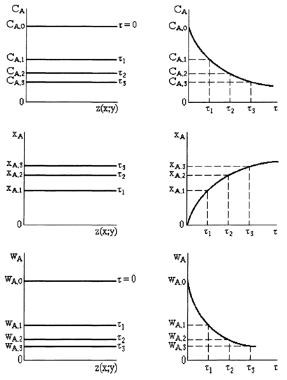 где CA,0; CA и СA,f - концентрация вещества А начальная, текущая и конечная соответственно.
