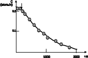После того, как оси размечены, откладывают экспериментально полученные точки в виде кружочков, квадратиков, крестиков и других фигурок; иногда диаметр этих фигурок отражает точность измерений. Далее эти фигурки соединяют плавной линией, без изломов. Допустимо, что некоторые экспериментальные точки выпадают из линии за счёт случайных ошибок измерений. Пример приведён на рисунке 1. Этот пример относится к первому графику лабораторной работы №1. Необходимо отметить, что в верхней части этого графика первые точки отражают переходные процессы, и делать описанные в методическом пособии построения следует после окончания переходных процессов (указано стрелкой). Рисовать карандашом. Методика определения порядка реакции n и константы скорости k описана в методичке.
