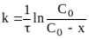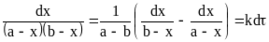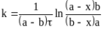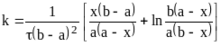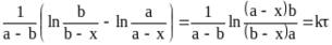 Для реакции третьего порядка, ограничиваясь случаем. когда две начальные концентрации одинаковы и равны а (С0’ = C0’’ = a), а третья начальная равна b (С0’’’ = b), уравнение для расчета константы скорости примет вид: