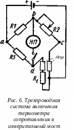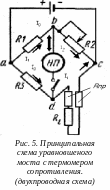 Мост состоит из двух постоянных сопротивлений R1 и R3, сопротивления R2 (реохорда) и сопротивления термометра Rt. Сопротивления двух соединительных проводов 2Rnp прибавляются к сопротивлению Rt. В одну диагональ моста включен источник постоянного тока (сухая батарея), а в другую — нуль-прибор [1].