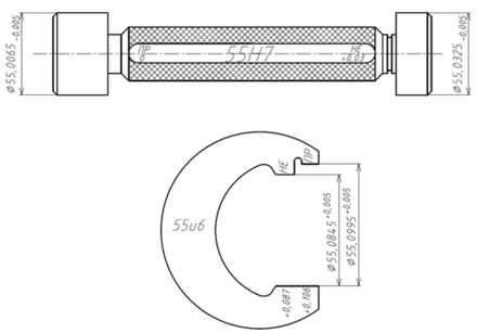 55 мм, поле допуска t6, предельные отклонения: верхнее +85, нижнее +66 мкм, поле допуска Т=19 мкм.