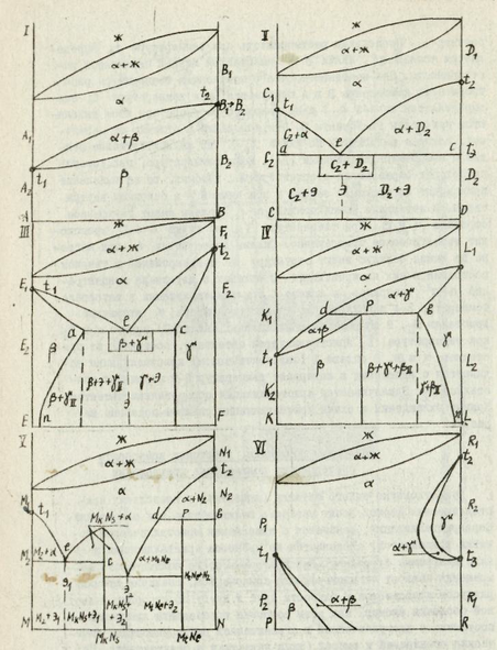 Существование одного металла (вещества) в нескольких кристаллических формах носит название полиморфизма или аллотропии. Перекристаллизация, связанная с изменением кристаллической решетки компонентов, сказывается на процессе кристаллизации и па виде диаграммы состояния. Вид диаграммы после полиморфного превращения зависит от изоморфности компонентов, различия атомных радиусов компонентов и близости друг к другу по строению валентной оболочки атомов. При этом возможно образование диаграммы состояния с неограниченной и ограниченной растворимостью, химических соединений и смесей (типа эвтектики и перитектики). На рис.8 изображены различные варианты диаграмм состояния I-УI, в которых при кристаллизации из жидкого состояния высокотемпера-