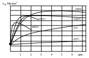 Процесс старения, или распада пересыщенного твёрдого раствора, является сложным процессом и протекает с различной скоростью у различных сплавов. Скорость старения в значительной степени зависит от температуры. Повышение температуры вызывает ускорение процесса (рис.4). При естественном старении (20ºС) прочность и твёрдость становятся максимальными через 5-7 суток после закалки, предел прочности возрастает до σВ≈45 кгс/мм2 (450 МПа), δ≈18%. При искусственном старении прочность и твёрдость возрастают тем быстрее, чем выше температура старения.