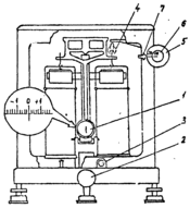 6. Десятые и сотые доли грамма (миллиграммовый разновес) выполнены в виде колец 4, подвешенных на крючках, и с помощью специального механизма нагружают на правое коромысло весов поворотом большого 5 и малого 6 лимбов. Поворот большого лимба позволяет нагружать десятые доли грамма (сотни миллиграмм), а поворот малого лимба - сотые доли грамма (десятки миллиграмм). Количество нагруженных миллиграмм читают против указателя - стрелки 7. Вначале нагружают поворотом большого лимба, а затем, когда найдено максимальное возможное количество десятых долей грамма, чтобы еще перевешивал образец, нагружают с помощью малого лимба.