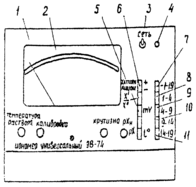 1- лицевая панель; 2- показывающий прибор; 3- выключатель; 4- индикатор включения прибора; 5- кнопка включения в режим милливольтметра; 6- переключатель полярности измеряемой Э.Д.С.; 7- кнопка включения грубого диапазона измерений; 8 - 11- кнопки включения точных диапазонов измерений