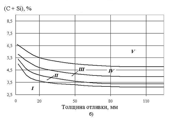 б) Влияние толщины отливки и суммы (С + Si) на структуру чугуна;