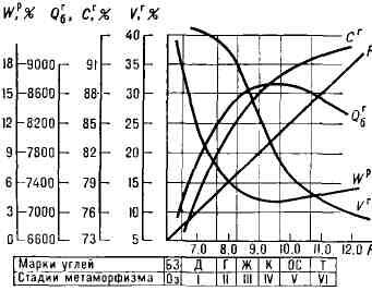 Структурно-молекулярная перестройка органического вещества при метаморфизме углей сопровождается последовательным повышением в них относительного содержания углерода, снижением содержания кислорода, выхода летучих веществ; в определённых закономерностях с экстремальными значениями на средних стадиях углефикации изменяются содержание водорода, теплота сгорания, твёрдость, плотность, хрупкость, оптические, электрические и др. физические свойства угля (рисунок 1).