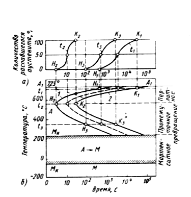 Как видно из рис. 1а в течении некоторого промежутка времени (Н1, Н2, Н3) распад аустенита экспериментально не фиксируется. Этот период называется инкубационным. По истечению времени аустенит начинается распадаться образование более стабильных структур. Через некоторое время (К1, К2, К3) процесс распада полностью заканчиваются или приостанавливается. Построение таких кривых после охлаждения до разных температур (t1,t2,t3 и т.д.) позволяет получить диаграмму изотермического превращения аустенита (рис. 1б)