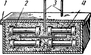 Расстояние между деталями должно быть 15—20 мм, а между деталями и стенкой ящика 15—25 мм. На первый ряд деталей насыпают карбюризатор и укладывают следующий ряд деталей, снова засыпают карбюризатор, и так до заполнения ящика до верха. Сверху ящик закрывают крышкой и обмазывают глиной (рис. 3).