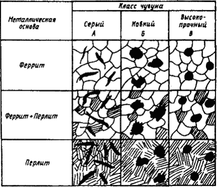 Рис. 11.3. Схемы микроструктур чугуна в зависимости от металлической основы и формы графитовых включений