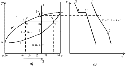 Чистые компоненты А и В кристаллизуются при постоянной температуре, кривая охлаждения компонента В представлена на рис. 5.1,б.