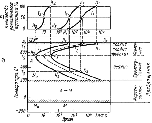 Рис. 12.5. Кинетические кривые превращения аустенита при охлаждении (а); диаграмма изотермического превращения аустенита (б)