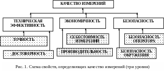 Представим свойства, определяющие качество измерений (процесса измерений, измерительной процедуры) в виде иерархической структурной схемы, ограничившись для начала тремя уровнями. Для первого уровня схемы предлагается три блока свойств (рис.1): "техническая эффективность", "экономичность" и "безопасность", хотя техническое совершенство измерений, как и любого иного объекта, не может быть независимым от экономичности, а безопасность можно рассматривать в двойной связи (и с экономичностью, и с техническими свойствами). При построении структуры надо учитывать, что абсолютно независимых страт (классификационных групп) не бывает.
