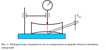 Появление методической погрешности второй группы (погрешности из-за некорректной идеализации реального объекта измерений) можно рассмотреть на примере измерения диаметра номинально цилиндрической детали станковым средством измерений (измерительной головкой на стойке). В частности, измерение детали с седлообразной поверхностью приведет к появлению методической погрешности, примерно равной отклонению образующей от прямолинейности (рис. 2). Приведенный пример показывает, что некорректная идеализация формы объекта при линейных измерениях может привести к возникновению методических погрешностей, которые могут существенно превышать инструментальную составляющую.